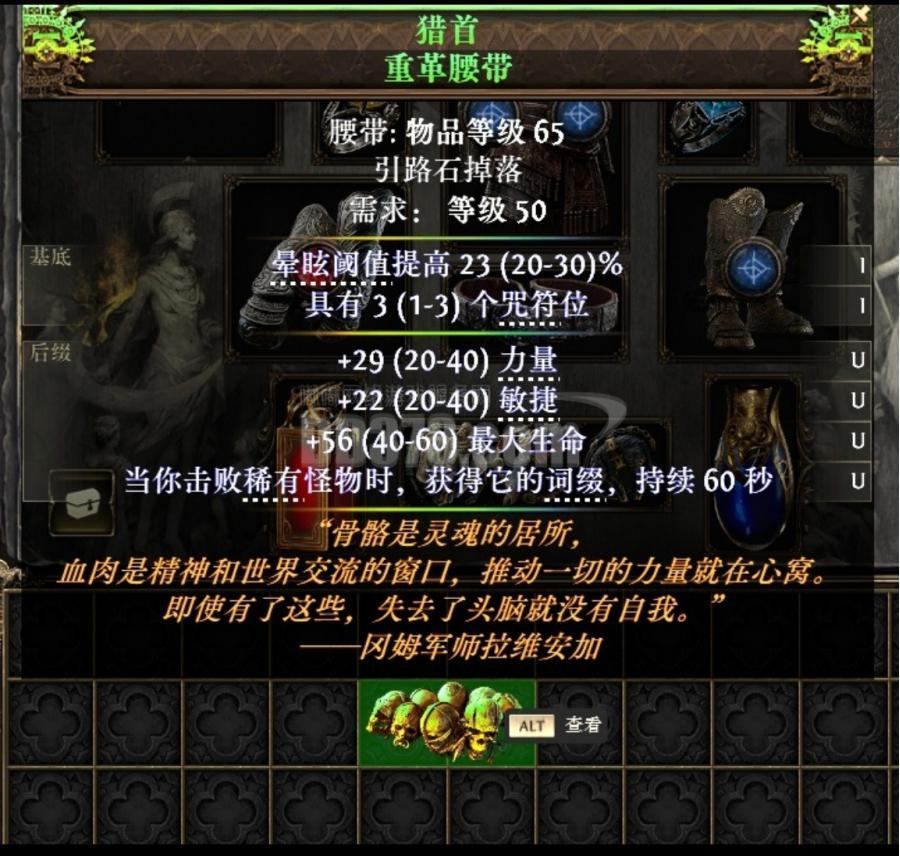 腰带,需求等级 70;核心效果:击杀稀有敌人后偷取其词缀 20 秒,移动速度提升,是所有速刷 BD 的终极目标。