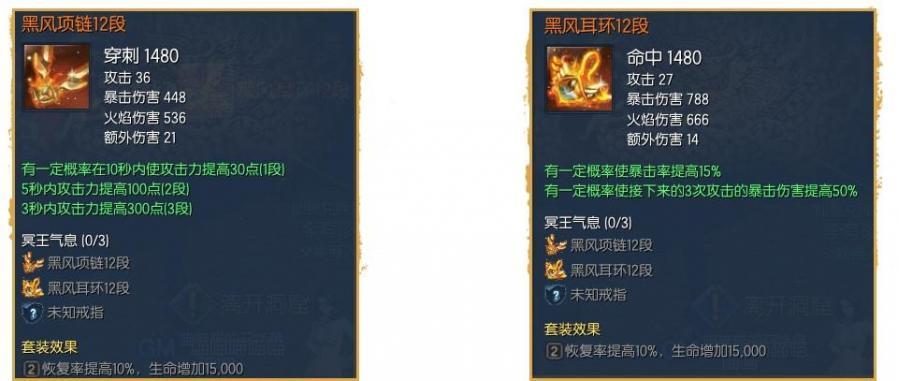 攻击 + 82,全伤 + 12%,生命 + 800;4 件黑风(项链 + 耳环 + 腰带 + 手镯):破防效率 + 25%,对 BOSS 伤害 + 18%;螺旋寺院掉落